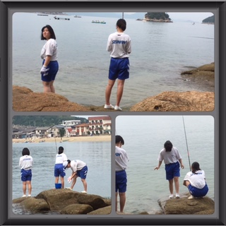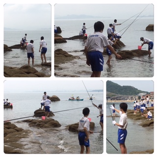 「餌つけて〜」と男子。生物を触れない子どもたちがいますね。船に乗れなかった子どもも釣りを楽しんでいます。潮も引いてだいぶ岩場が増えました。