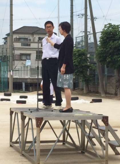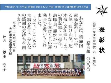 終わってから先生方で振り返ってみて、この運動会を作ってくれたものは、あれに違いないと気づきました。それは、「やる気、負けん気、超本気」のテーマです。そして、そのテーマを作ってくれた69期生に表彰状を授与することにしました。朝礼台の上に登って来てください。(表彰状授与)