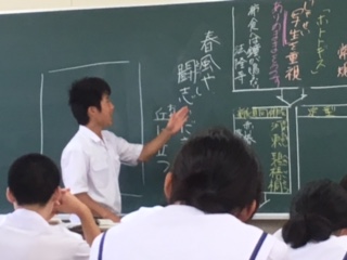 5時間目の国語の授業です。碧梧桐に対し、「春風や闘志いだいて丘に立つ」と詠んだ高浜虚子の思いは?の問いに、一生懸命考えて 「丘に立ちところから、自殺する心境では」「春風のように闘志を抱いて丘に立つ虚子」など、積極的に意見を述べる3組のメンバーです。