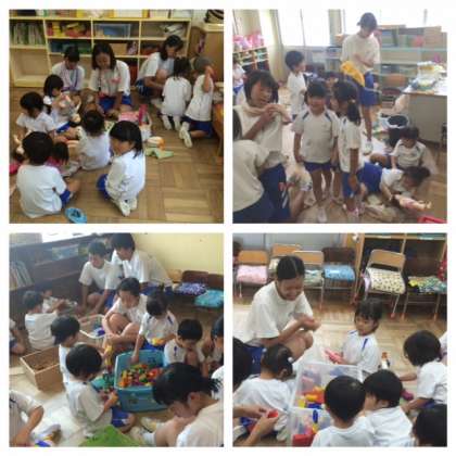 園児たちのパワーに押され気味ですが、やさしく笑顔で楽しく触れ合うことができたようです。本当に子どもたちは遊びの名人ですね。