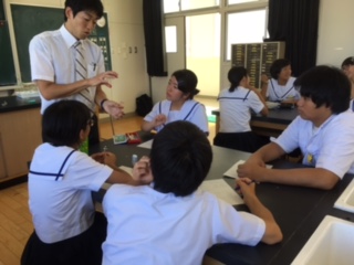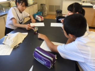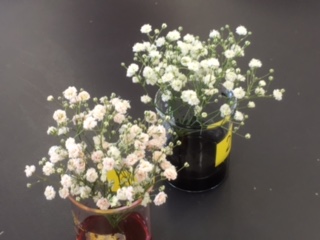 住吉高校の先生に、食紅とインクとでかすみ草の色を染める実験をしていただきました。食紅は染まるのに青いインクはなぜ染まらないんだろう。赤い色でも、染まる花と白い花とあるのはなぜかなあ〜と疑問を持つ生徒です。茎からの距離によるのかなあ〜とか、中には、「優しさが足りなかったのかも」という人も。たくさん考えを持てて素晴らしいと褒めていただきました。