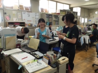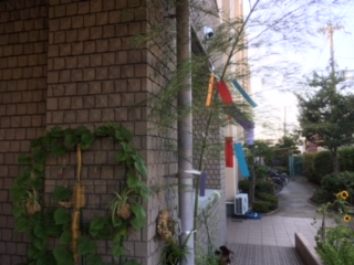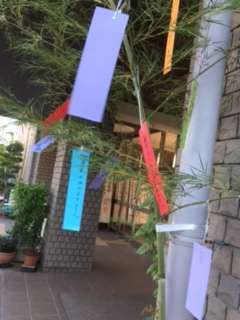 明日は七夕です。教頭先生と管理作業員さんの計らいで、玄関に笹が立ちました。先生方早速願いを綴ります。