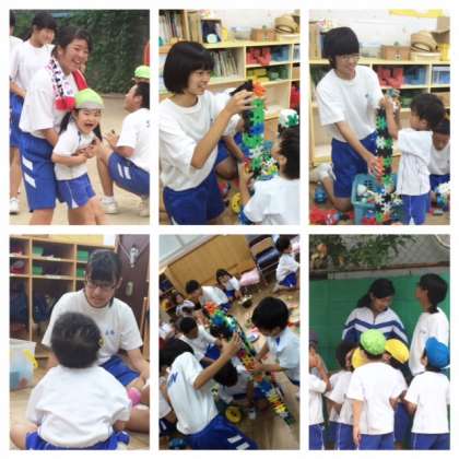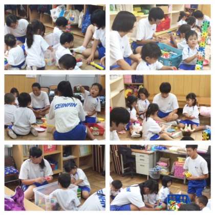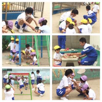外グループは、泥だんご、虫とり、うんてい、リレー、かごめかごめ、ジャングルジムなどなど。汗だくになりましたね。蒸し暑い中で一緒に遊んでくれたお兄ちゃんとお姉ちゃんに感謝です。