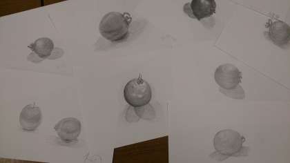 先日の活動日に行ったミニトマトのデッサンです。早い人で35分、実際にトマトを前にして描きました。トマトの丸い立体感、赤と緑の色彩が感じられるように描くのはなかなか大変です。床面に映る複雑な影も頑張りました。