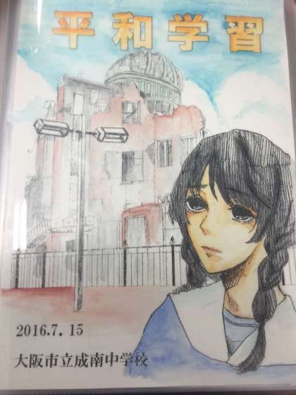 さて、この度、増田先生より平和学習のワークシートが届きました。まずはすばらしい表紙の絵に驚きました。原爆ドームが丁寧に描かれ、それを見つめる女の子の悲しそうな表情が印象に残ります。この女生徒は、原爆ドームの姿を見つめながら、71年前の原爆投下という悲惨なできごとを精一杯受け止めようとしています。そして戦争は二度とあってはならないと胸の中で決意しているようです。あの日の授業を聞いてこの絵を描いてくれたのでしょう。魂の込められたこの絵は、私の宝物になりそうです。ありがとうございました。