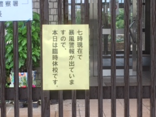 台風16号接近に伴い7時現在で暴風警報が発令したため休校です。