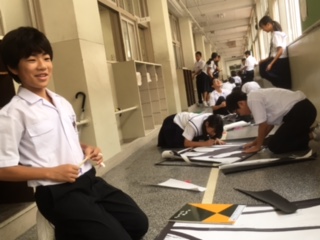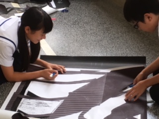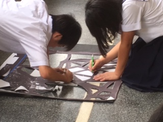 いよいよ1年生のステンドグラスの展示の取り組みが始まりました。グループで慎重にカッターを使って切り出していきます。さて、どんな作品が出来上がるのでしょうか?