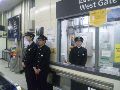 写真は、改札口での案内・挨拶のようすです。いつもより緊張した顔つきで頑張ってます。