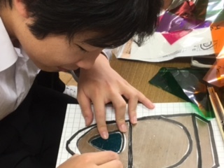 静かに勉強に取り組む2年生です。美術では進み具合も差が出て来ますが、黙々と個性豊かな作品が出来上がっていきます。「先生、学校で寝ていいんやったら作品仕上げたい」という生徒もいましたよ。