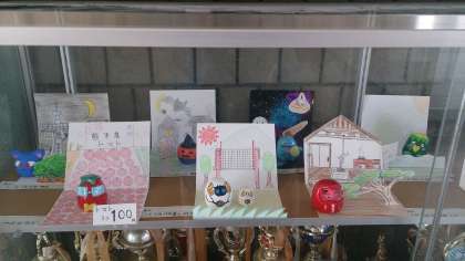 玄関展示ケースに1年のオリジナルだるまも展示しました。丸い形から色々なキャラクターを考えていきました。背景も立体感をだし、こちらもビックリするような工夫がされています。ぜひ、見てください。
