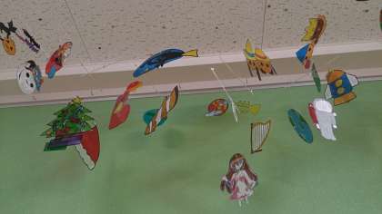 今日、授業のあった2クラスだけ美術室の天井から飾りました。ステンドグラスのモビールです。廊下側の窓から覗いてもらえば、少し見えます。全クラス合わせて、皆さんに見ていただける場所に飾りたいなぁと思案中です。