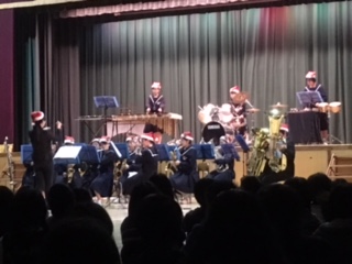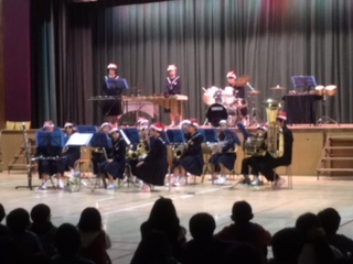 10:45分から岸里小学校全児童が待ってくれていた講堂に本校の吹奏楽部がクリスマスハットをかぶって登場です。