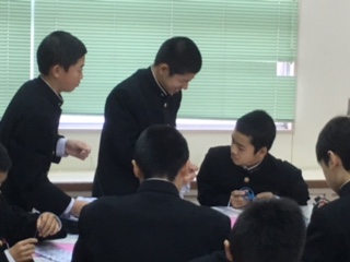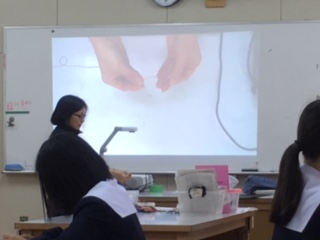 袋を縫っています。針に糸を通すうまいやり方や玉結びの作り方を書画カメラや動画を見せて学びました。グループの教え隊が班員に上手に説明しています。協力して学ぶ姿が素敵な1年4組でしたよ。