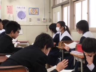 スピーチの原稿に対するクラスメイトからのアドバイスをもらって、どんどん磨きがかかります。ゆっくりと顔をあげて読もうと思ったことをすぐにペアで実践し、文書の再構築する人も。人にいかに伝えるのかという技術や心をこれからも育んでいきましょうね。