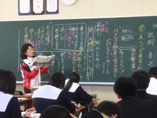 魯迅の「故郷」を学びました。雇い人の息子の閏土の気持ちや出来事をみんなで解いていきます。みんなの発言に笑ってしまうこともありますが仲の良さが伺える3組です。