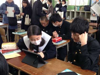 授業の最後にタブレットを使った問題ソフトは、なんと英語科の先生の手作りです。