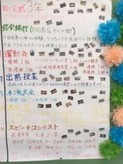 1年生から今までの学校行事やその思い出の写真がちりばめられています。写真を用意された先生や生徒の皆さんの協同作業です。そこには「最大限の愛」が感じられます。小さな写真に思いを巡らせる3年生の姿を見れるのもあと少しになりましたね。