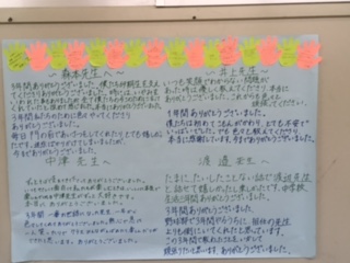 愛に満ちた3年生の廊下には、学年所属の先生方に対するメッセージが綴られています。お世話になった思いが一文字一文字から伝わって来ます。