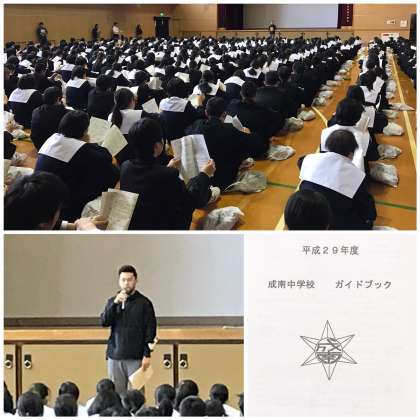 4月12日6限目に全校集会の形式で生活指導部の先生方から、朝の学活で配られたガイドブックを使って、成南中学校のルールの説明がありました。2・3年生にとっては2回目・3回目の説明ですが、改めてしっかりと確認していました。