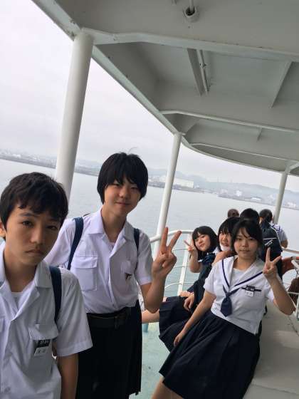 あいにくの天気です。いまフェリーに乗り込みました。半袖では少し寒いくらいです。