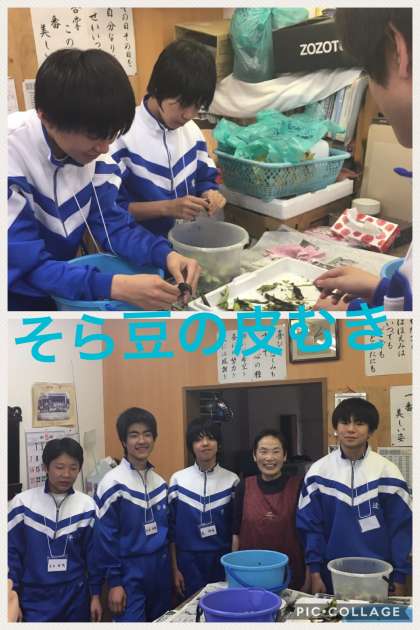 収穫したそら豆の皮むきをしています。お家の方から助かるわ〜とお言葉いただきました。