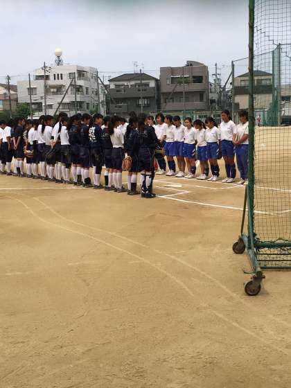 グランドではソフトボール部が練習試合をしています。1年生もドキドキしながら試合に出ています。