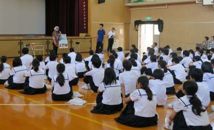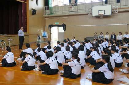 続いて西成警察署から、まず少年犯罪に関して、クイズも交えながらお話してくださいました。例えば、夜遅く(午後10時以降、ただし、明らかに塾から寄り道せずに帰宅中だとわかる場合は別です)に出歩いていればおまわりさんから声をかけられたり補導されたりもします。やはり、犯罪に巻き込まれる可能性が高まる時間だからです。被害者にも加害者にもなってしまう可能性があります。犯罪の中でも人を傷つける行為は一段と罪が重くなります。また、時間には関係なく、最近急激に増加しているのがケイタイやネットに関する被害です。特に性犯罪が多く、回復できないような心の傷を負うことになりかねません。まず自分が一番大切だという意識を持ち、同様に友達も大切にする気持ちを持ってほしいと締めくくられました。