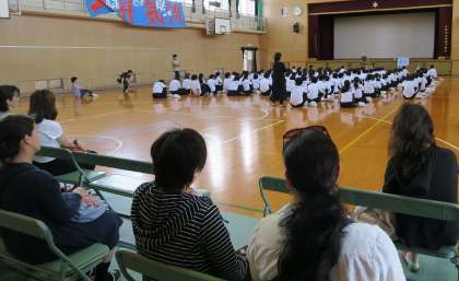 まず、保護司会からあいさつがあり、「保護司さん」の役割についてもお話くださいました。社会から犯罪がなくなることを願い、一つには罪を償った人たちが社会生活を営んでいけるように支援し、一般の人たちの偏見や差別をなくす活動をしておられます。また、日頃から犯罪の芽が育たないように様々な活動もされています。あまりなじみがないと思っている生徒も多いのですが、実は登下校の見守り活動もしてくださっていたりして、知っている保護司さんと会釈を交わしている人もいました。