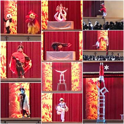 獅子舞にパンダ、変面、ツバメの輪くぐり、柔術、ヘッドバランスや高椅子、帽子。