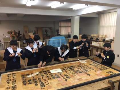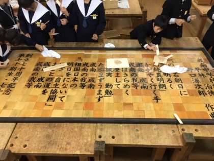 文化祭で1,3年で取り組んだ木彫校歌を1年生の学級委員長達が、木枠にボンドで一枚一枚、板を貼り付けています。14日の放課後に取り組みました。体育館にかけるのは22日以降になりそうです。