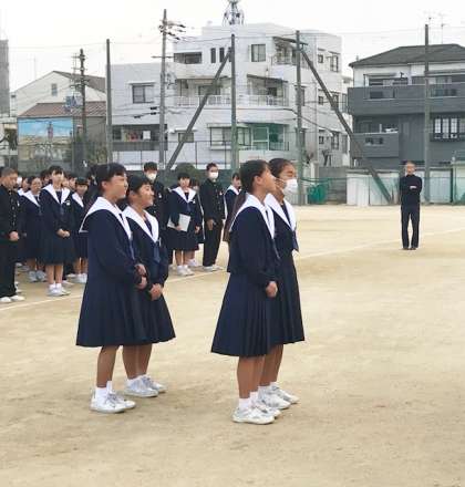 また、部活動の表彰状伝達を行いました。ソフトテニス部が7ブロック新人大会1年生女子の部で優勝・準優勝、バレーボール部が西成区・大正区ウインターカップで優勝の成績を収めました。