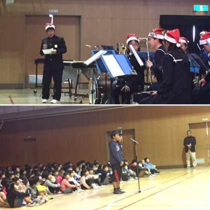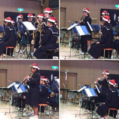 12/25日、終業式のあと岸里小学校でクリスマスコンサートを行いました。サンタ帽をかぶり、クリスマス曲やアニメメドレーを演奏しました。楽器紹介では、1人でソロを演奏して、少し緊張しているようでしたが、小学生の皆が歌を口ずさんでくれましたね!
