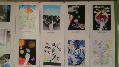 玄関展示ケースの作品を入れ替えました。3年生の「手のある空想画」です。