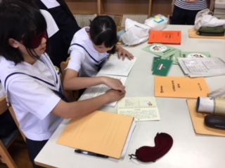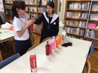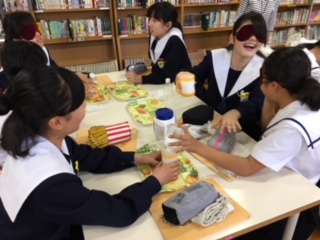 ユニバーサルデザイン、点字、アイマスク、視野狭窄、白内障の体験の様子です。白内障は高齢化に伴いかなり多くの人に起こることですが、とても考えられないという様子でした。