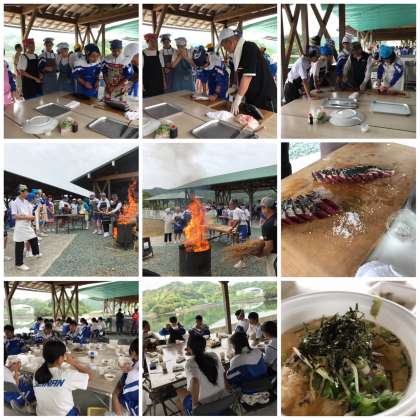 鰹のたたき作り体験とみんなで集合写真。