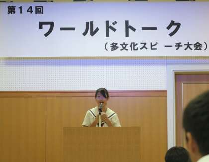9月8日(土)市立咲くやこの花中学・高等学校にて第14回ワールドトーク(多文化スピーチ大会)が開催されました。諸外国から渡日・帰国した生徒の皆さんが、これまで身につけてきた言語を忘れないように使い続け、日本語を修得した後どちらのことばにも対応できるのはすばらしいことです。この大会はそんな願いも込められ、大阪市立の中学校に通う同じ言語を話す仲間と出会い交流できる場として毎年行われています。