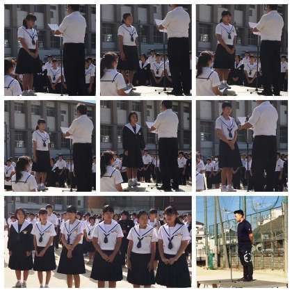 1・2年生13名が理科の自由研究で表彰されました。「調味料が作り出す泡の不思議」「保冷剤と氷の違い」「ペットボトルに雲発生」「フルートとアルトリコーダー 振動数と波形の比較」‥‥どの研究も題目を聞いただけで内容に興味津津。文化祭で展示されるので、ぜひ見てください。