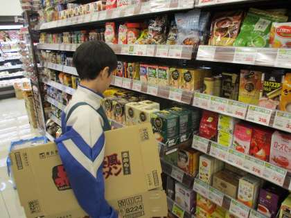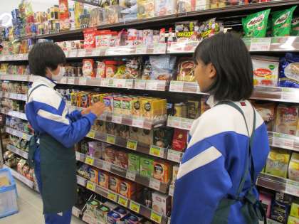 販売関係の体験学習です。お店のエプロンをつけて、商品の品出しをしていました。エプロンがよく似合っています。