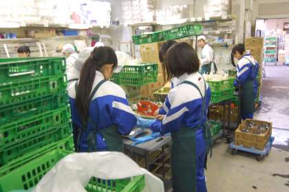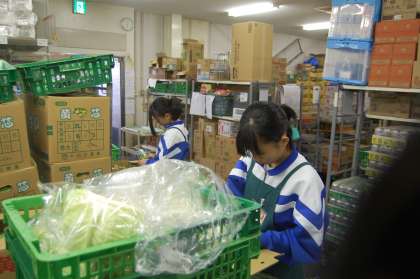 普段入ることのできないお店の裏側で、野菜を袋につめる作業などを行いました。