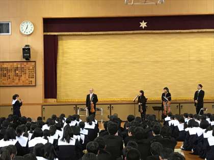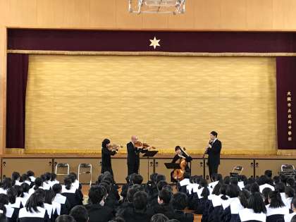 12月19日、西成区の事業で「大フィルメンバーによるワークショップ」が本校にて開催されました。ヴァイオリン・ヴィオラ・チェロ・クラリネットの各奏者4人の皆さんによる演奏を聴くことができました。