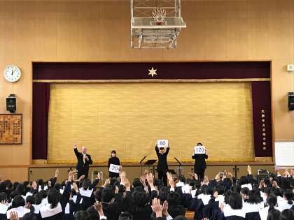 大阪フィルハーモニー交響楽団は成南中学とほぼ同じ、まもなく創立72年を迎える日本を代表するオーケストラで、現在は地元西成区を拠点とする世界に誇ることのできる楽団です。その団員である一流の奏者の演奏を目の前で聴く貴重な機会となりました。吹奏楽部の人たちにとってはこの音を頭でイメージしておければ、自分たちの演奏の実力を一層飛躍的に高めることができるかもしれませんね。また、メンバーからどのようにして団員になったかといったお話を聞き、大フィルにまつわるクイズで年間120回もの演奏会を開催していることや、この季節によく演奏されるベートーヴェンの交響曲第9番の演奏回数は日本1であることもわかりました。