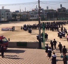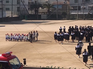 12月21日、地震・津波を想定した避難訓練を実施しました。今回は、初めての試みとして、聖化保育園の3歳児クラスと合同で訓練を行いました。生徒全員が、真剣な顔つきで、落ち着いて取り組むことができ、西成消防署の方からもお褒めの言葉をいただきました。今後も、地域の方々と合同で避難訓練が実施できればと思っています。