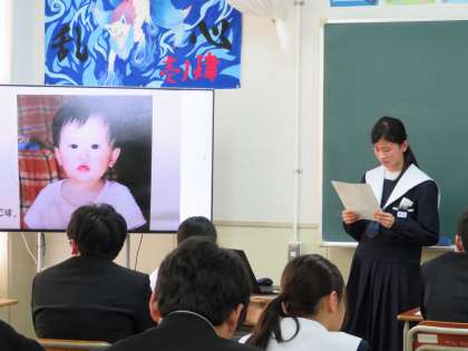 性教育2日目は、冬休みの宿題で保護者の方に書いていただいた「私の誕生記録」を各クラスで発表しました。小さい頃の写真はみんな可愛く、幼い頃のエピソードや保護者からの言葉に思わず涙が流れた子もいたそうです。どのクラスも、心がほっこり暖かくなるような良い雰囲気の発表でした。