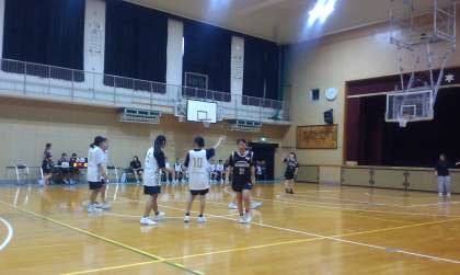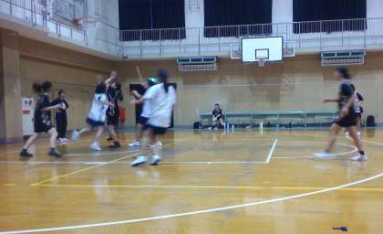 女子バスケ部が練習試合を行っています。ボールに集中しながら相手の動き、チームメイトの動きを見てディフェンス、オフェンスともにしっかり走っています。