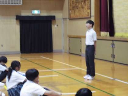 先生からは「『夏休み38日間、何かを毎日続けてみよう』というお話をしましたが、みなさんはいかがでしたか。先生は毎日5kmのランニングと言いましたが、毎日はムリでした。それでも、合計200kmは達成できました。さて、金曜日はいよいよ文化祭です。日を追うごとに合唱も上手になってきました。『2倍の声を出して!』と言われたら、ちゃんと2倍の声が出ているのはいいのですが、それはそれでもったいないなと思います。言われたらできる。言われなかったらどうでしょう。みなさんのこれまでの頑張りは1年の先生たちは知っています。しかし、他の先生たちや先輩方、おうちの方々は知りません。本番の一発勝負で見せないといけません。言われなくとも、自分たちで初めからしっかりと声が出せるかどうかにかかっています。みなさんの気持ちの持ちようが大事です」というお話がありました。
