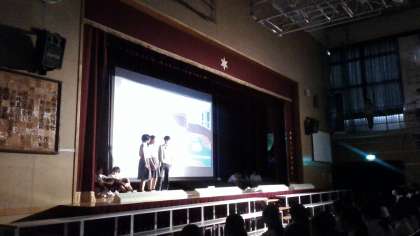 2年生の舞台発表です。2年生は「防災・減災」〜私たちにできること〜 というテーマで調べ学習や展示物、劇やクイズを用いて防災の大切さや知識について発表しました。