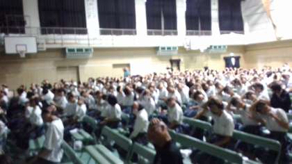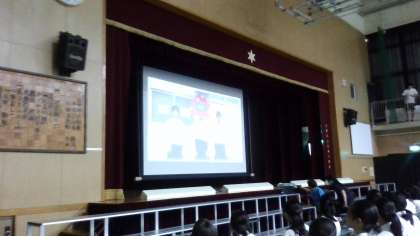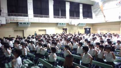 保健委員の発表です。ミャクミャクと一緒に簡単ストレッチを紹介してくれました。会場の生徒も一緒にストレッチをして、舞台鑑賞のちょうどいいタイミングで体をほぐしてくれました。