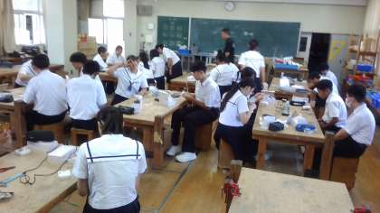 美術では「自分の将来の顔」を粘土で作成しています。技術ではセンサーライトの作成をしています。はんだごてを使ったり細かい作業に集中しています。