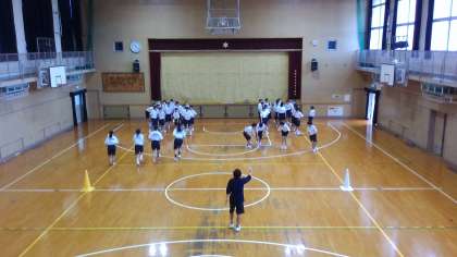 体育では体育大会の種目になっている「台風の目」を行っています。体育館で行うのは少し狭いですが、力を合わせて頑張っています!