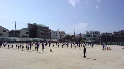 1年生の学年練習の様子です。いよいよ今週に迫ってきました体育大会に向けて、体操や全体の動きを合わせる練習をしています。退場ではみんな駆け足で移動しています!